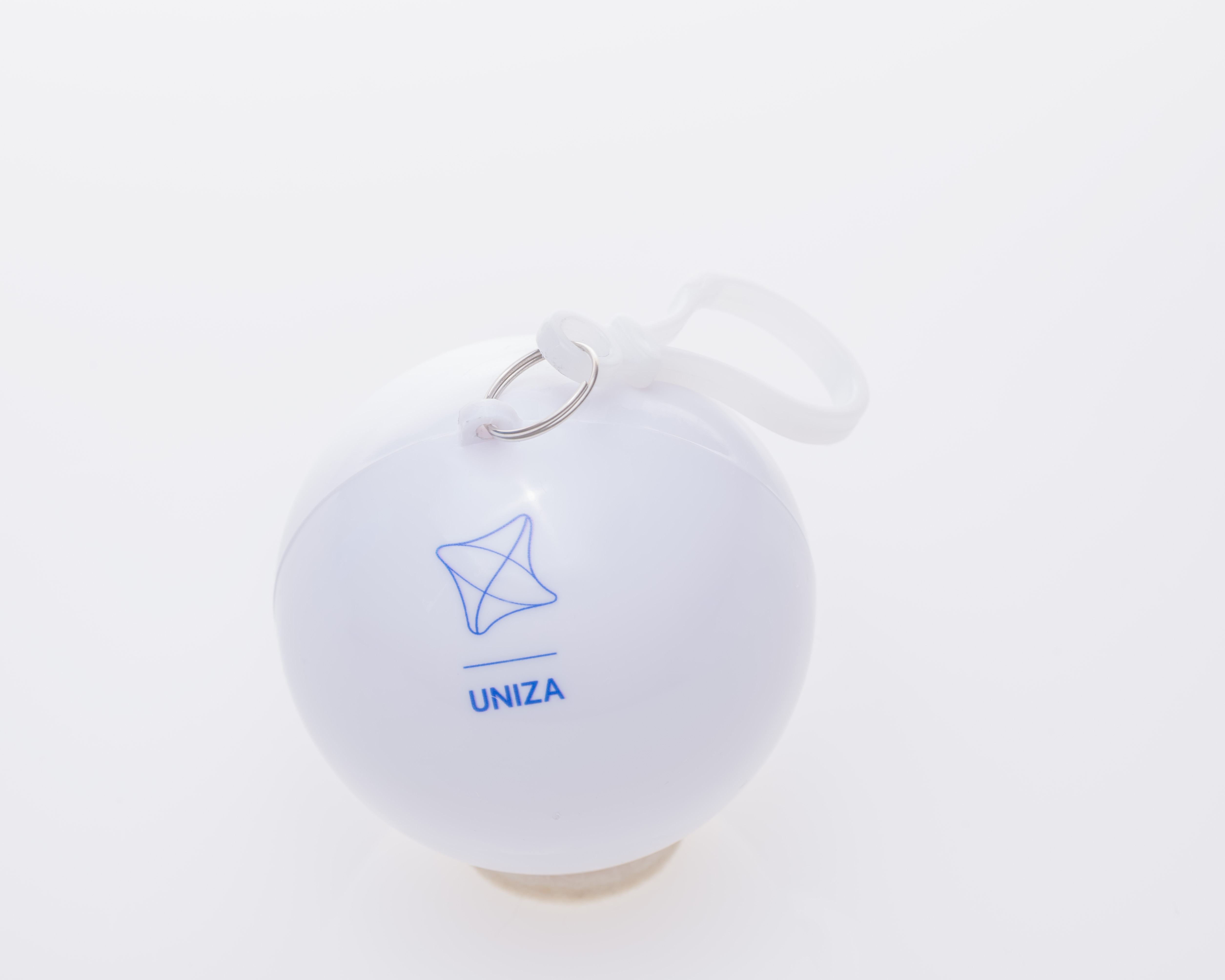 Transparentné pončo balené v bielej plastovej guli s karabínkou na zavesenie.