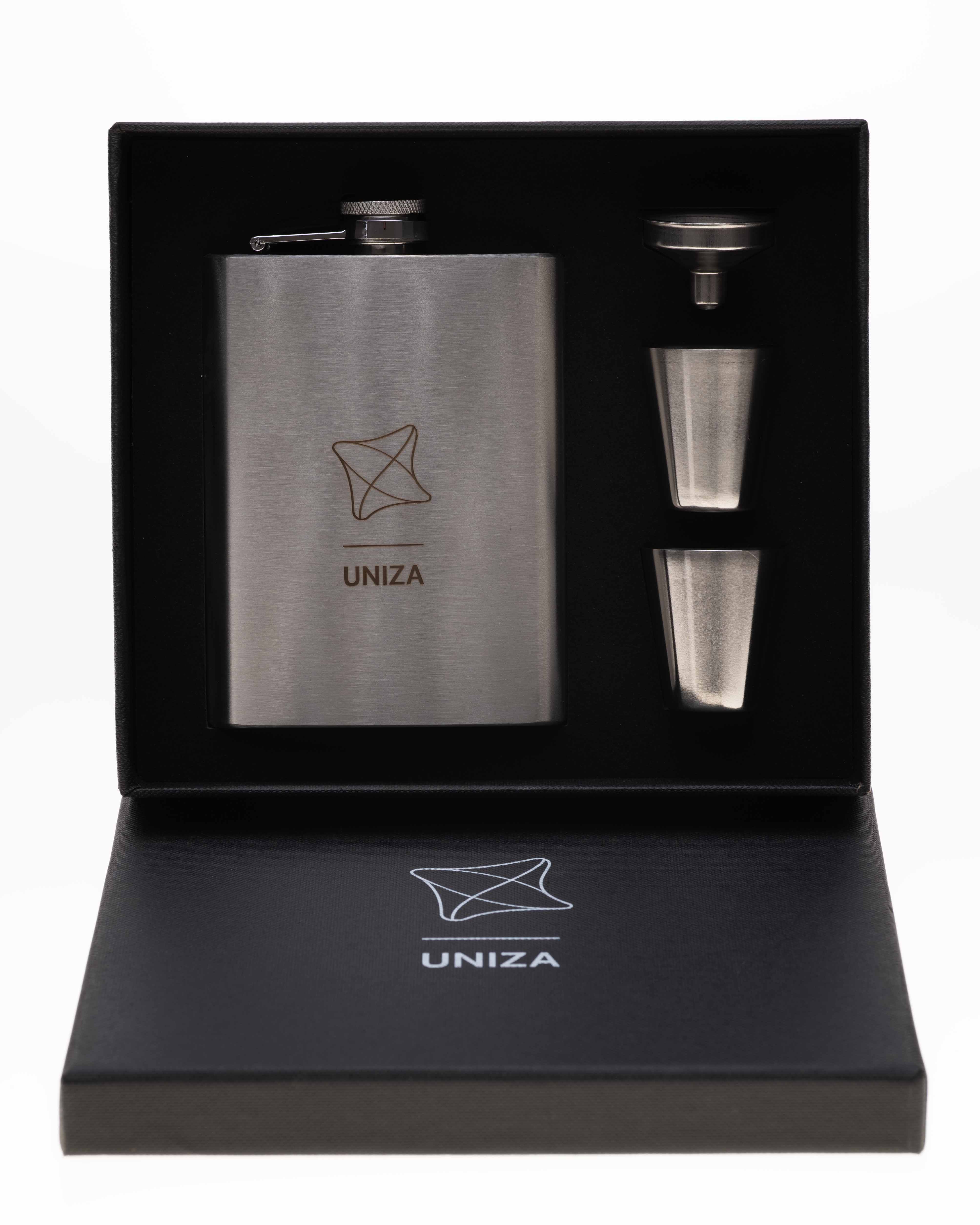 Nerezová darčeková cestovná súprava balená v čiernej krabičke, ktorá obsahuje ploskačku s objemom 230 ml, nálievku a 2 poháriky.