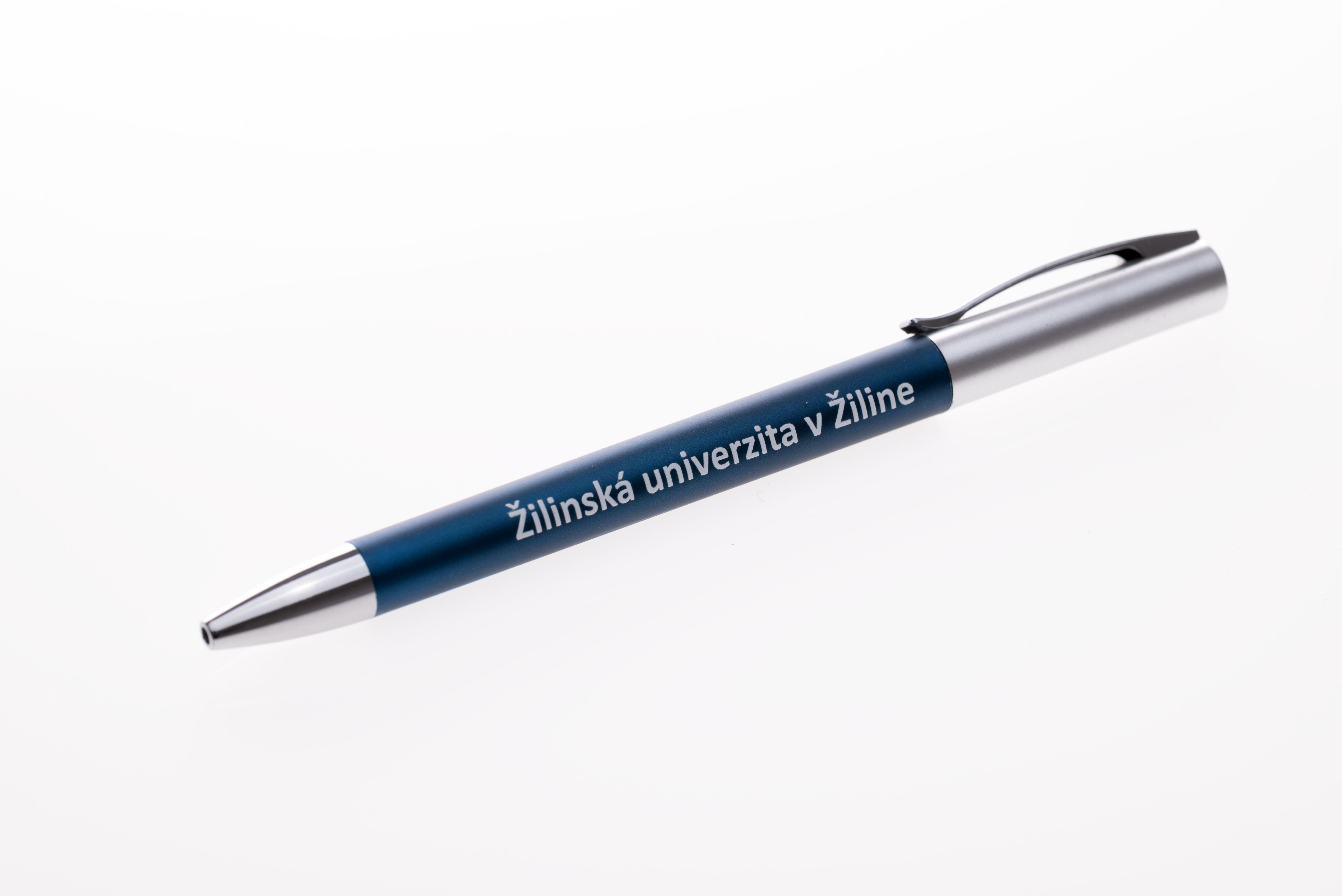 Guľôčkové pero s otočným mechanizmom, kovovým klipom a modrou náplňou.