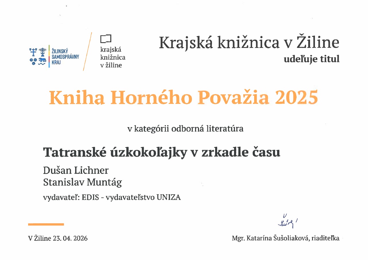 Publikácia Tatranské úzkokoľajky v zrkadle času získala ocenenie Kniha Horného Považia v kategórii Odborná literatúra