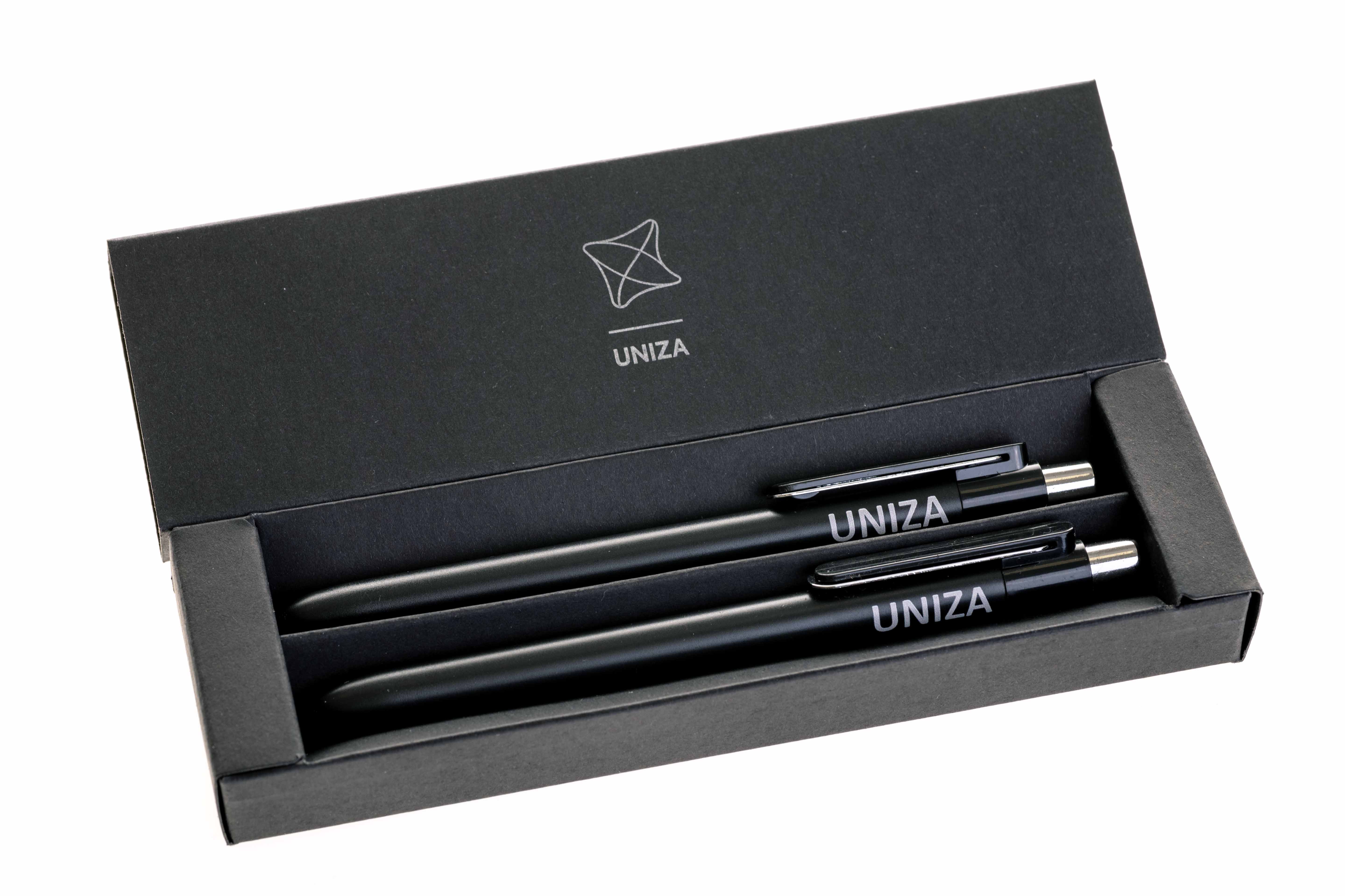Pero a ceruzka sú gravírované, krabička má logo UNIZA.